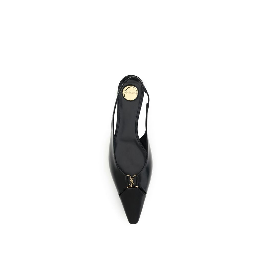 Saint Laurent’s Babylon Ballerinas reinterpret classic elegance with a distinctive modern twist. Open at the back, they feature a sleek silhouette thanks to an elongated cut-out toe, embellished with the iconic CASSANDRE signature in bronze-colored metal. The elasticized strap ensures a snug and comfortable fit, while the round Saint Laurent engraved plaque on the insole adds a refined and recognizable detail. Perfect for chic, casual style.